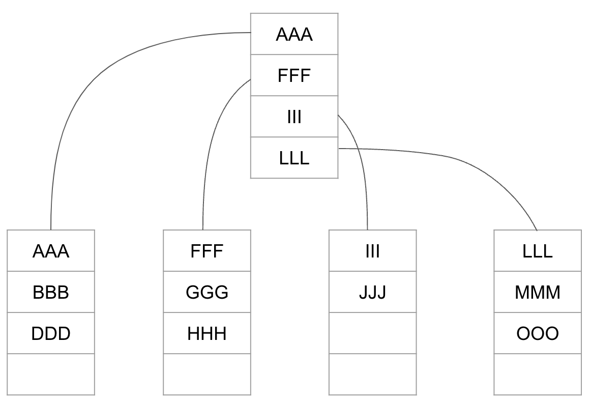 문제는 이 다음 GGG 데이터를 추가할 때 발생한다. GGG 데이터를 추가하면 FFF 블록 다음에 GGG를 추가해야 하는데 빈 공간이 없어 인덱스 분할 작업이 발생한다. 이어서 데이터를 추가하다보면 결국 루트노드에도 빈 공간이 없기 때문에 루트노드에서도 인덱스 분할이 일어나게 되고 결국 데이터를 추가한 것 만으로 연쇄적으로 많은 작업들이 발생하게 된다. 위와 같은 인덱스 분할 작업은 비용이 많이 들기 때문에 성능에 큰 영향을 주게 된다.