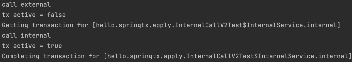 internal() 메서드를 별도의 클래스로 분리하고 스프링 빈으로 등록하여 external() 메서드가 있는 클래스에 의존성 주입 해주었다. 이때 internal() 메서드에 @Transactional 어노테이션이 선언되어 있으므로 프록시 객체가 주입된다. 이러면 프록시 객체를 통해 internal() 메서드를 호출하므로 externalCall() 메서드를 실행했을 때 아래와 같이 정상적으로 internal() 메서드에 트랜잭션이 적용된 것을 확인할 수 있다.