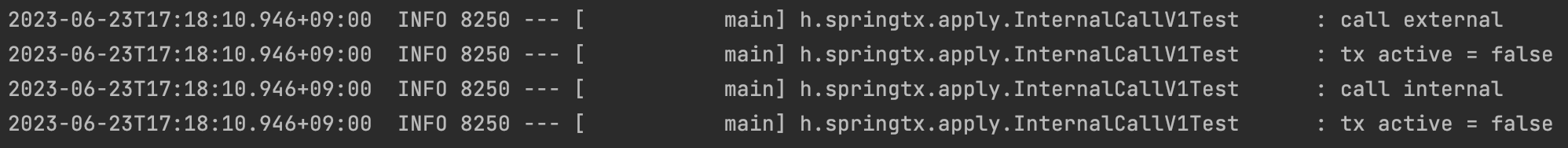 external() 메서드는 @Transactional 어노테이션이 선언되어 있지 않기 때문에 트랜잭션이 비활성 상태인 것을 확인한 후 internal() 메서드를 호출한다. internal() 메서드에는 트랜잭션이 선언되어 있기 때문에 internalCall()을 통해 호출했을 때처럼 활성 상태로 출력될 줄 알았지만 결과는 아래와 같이 트랜잭션도 시작하지 않고 로그도 false로 출력됐다.
