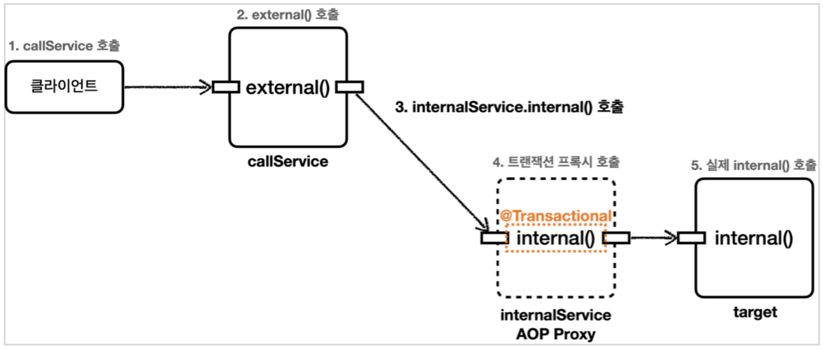 현재 external() 메서드는 @Transactional 어노테이션이 선언되어 있지 않기 때문에 프록시 객체가 아닌 실제 객체를 통해 호출한다. 이때 internal() 메서드를 호출하면 this가 생략되어 있으므로 현재 인스턴스 즉, 실제 객체에서 internal() 메서드를 호출하고 결과적으로 프록시 객체를 거치지 않기 때문에 트랜잭션이 적용되지 않는다.