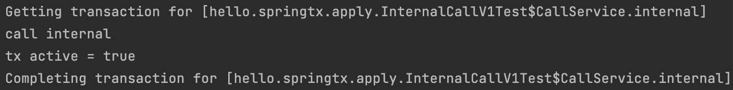 아래와 같이 정상적으로 트랜잭션이 시작하고 printTxInfo() 메서드를 호출하여 트랜잭션이 활성 상태인 것을 확인한 후 마지막으로 트랜잭션이 종료된 것 까지 확인할 수 있다.