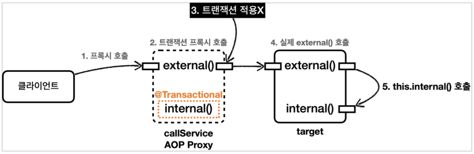 현재 external() 메서드는 @Transactional 어노테이션이 선언되어 있지 않기 때문에 프록시 객체가 아닌 실제 객체를 통해 호출한다. 이때 internal() 메서드를 호출하면 this가 생략되어 있으므로 현재 인스턴스 즉, 실제 객체에서 internal() 메서드를 호출하고 결과적으로 프록시 객체를 거치지 않기 때문에 트랜잭션이 적용되지 않는다.