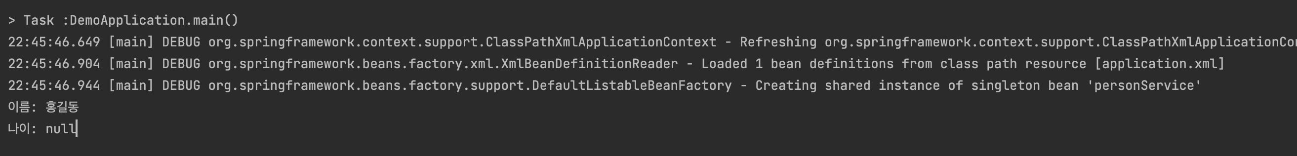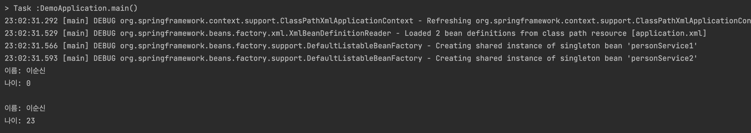 자바 설정 파일은 클래스위에 @Configuration 어노테이션을 작성하고 빈으로 등록할 객체를 리턴하는 메소드 위에 @Bean 어노테이션을 추가해줌으로써 빈으로 등록할 수 있습니다. 그리고 나서 PersonServiceImpl과 PersonRepository에 작성했던 @Component 확장 어노테이션을 지워주고 아래 코드를 실행해주면 xml파일로 테스트했을 때와 같은 결과가 출력됩니다.
