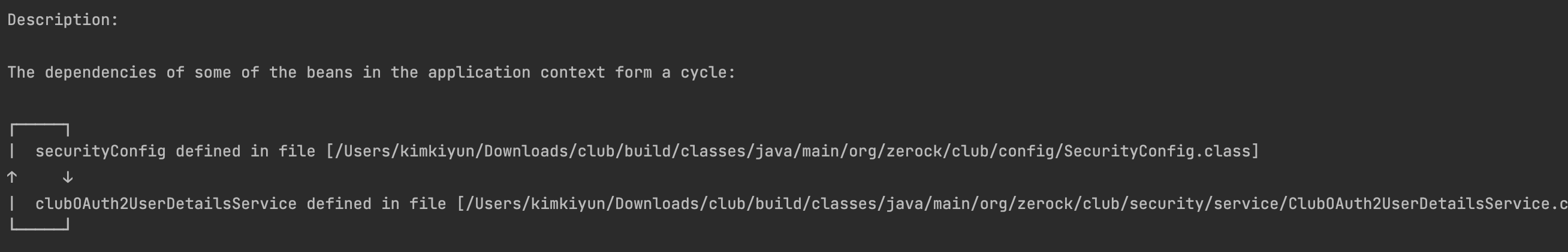 코드 리뷰를 해보니 SecurityConfig 클래스에서 참조한 OAuth2UserDetailsService 클래스에서 다시 SecurityConfig 클래스에서 빈으로 등록한 PasswordEncoder 인터페이스를 참조하면서 생긴 에러였다.